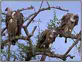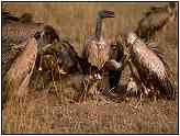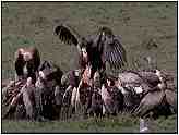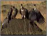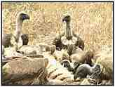 African White-BackedOrder: Falconiformes. Family: Accipitridae. (Old World vulture). Scientific Name: Gyps africanus. Common Names: African White-backed Vulture. African White-Backed Vultures (Photograph Courtesy of Bill Strahle Copyright ©2000)Conservation Status: Common. This is the most numerous of the African vulture species. Rescue & Recovery: None. Geographical Range: The more northern areas of Africa. Habitat: A tropical species and an inhabitant of the African plains, savannahs, and occasionally desert regions. African White-Backed Vulture (Photograph Courtesy Gerald and Buff Corsi, California Academy of Sciences Copyright ©2000)Physical Characteristics: If this bird's white rump is not visible it is extremely difficult to separate from the Cape Vulture, a situation made even more difficult by the fact that their territories overlap. The tail feathers are dark whereas the lower wings are quite light in colour. Eyes are dark brown and the black skin of the head and neck is coated in a white or yellowish down. Dark limbs propel the birds across the plains during their very laboured takeoffs. The young have a darker body colour and the head and wings are spotted. African White-Backed Vulture (Photograph Courtesy Gerald and Buff Corsi, California Academy of Sciences Copyright ©2000)Food: The African White-backed Vulture depends upon other smaller vultures to lead it to the site of a kill. In turn, once one African White-backed Vulture lands at a potential meal its obvious black and white plumage makes it readily visible to other birds which also join in the feast. In this way many birds are collectively covering a much wider area than would be possible for a single vulture. These vultures feed primarily upon large game, from hippopotamus that of died of natural causes, to wildebeest which drowned during migration, to elephants, rhinos and any other sizeable source of carrion. It is common to see up to two hundred birds feeding from one carcass, which explains how the corpse of an elephant can be stripped clean in just a matter of hours. After feeding they will frequently bathe to keep their feathers in prime condition. Despite their ghastly habits, vultures are one of the fussiest birds when it comes to cleanliness. African White-Backed Vulture (Photograph Courtesy of Cliff Buckton (Copyright ©2000)Reproduction: May live singly or in colonies, but even single individuals tend to reside reasonably close to a main grouping of African White-backed Vultures. During mating season the vultures pair up and fly in giant leisurely circles, male and female so close together that their wing tips all but touch. Nests are built high in trees and up to six nests may be found per tree. Along a 208 kilometre stretch of the Uebi Shebeli river observers once counted 250 nests. During the dry season one egg is laid and incubated for around 43 days. The mother stays with the chick until it leaves the nest, with the father being responsible for feeding the entire family. Thumbnails (Click For Full-Size Image):