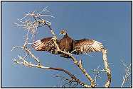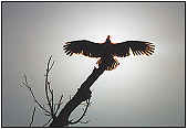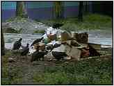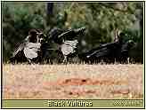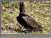 American BlackOrder: Falconiformes. Family: Cathartidae. (New World vulture). Scientific Name: Coragyps atratus Common Names: Black Vulture, American Black Vulture, or Carrion Crow. (Sometimes incorrectly called the Black Buzzard. 'Buzzards' are more properly broad-winged hawks). Black Vulture Photograph Courtesy of R.D. Scheer Copyright ©2000)Conservation Status: Common. In the Western hemisphere ome of the most numerous birds of prey, but the American Black Vulture is on the decrease, especially in Europe. Rescue & Recovery: As the scavenging habits of vultures provide such a benefit in removing sources of infection these birds are protected by law in most of the United States. Geographical Range: Found from the southern United States to central Patagonia. (North and South America). Habitat: Warm, open lands with some thinly wooded areas. Not found in deserts or on higher mountains. Physical Characteristics: This 55-68 centimetre long bird is almost completely black, right down to the bare wrinkly skin on its face. It is not until the Black Vulture takes to the air that white markings can be seen near the tips of its 1.5 metre wings. Maximum weight for this bird is about 1.9 kilograms with a length of about 56 centimetres, making the Black Vulture slightly smaller than the Turkey Vulture. To make up for this they are more aggressive than their cousins and quite capable of driving Turkey Vultures from a carcass. Like most vultures this bird is essentially silent, though when annoyed it may snarl or hiss, but without any great volume. In the wild these birds live for an average of five years. Black Vulture Photograph Courtesy of Stephen Hendricks Copyright ©2000)Food: Most of the diet is carrion, though Black Vultures also feed on eggs and the fruit of the oil palm. This bird has discovered that road kill is an easy source of food and they can be found regularly patrolling main roads. They often become victims of the same cars which provide them with such easy meals. When the opportunity presents itself they will sometimes kill small ground creatures or domestic animals. Even vulture species which do kill prey practice this only rarely and vultures have weak feet with shortish toes as against strong talons suitable for hunting. Has taken to following the sent-seeking Turkey Vulture as a source of a food supply. When it comes to attacking a carcass the Black Vulture depends upon other species of vulture to tear open the tough hide. It has a thin weak beak and so cannot do this for itself. Black Vultures will fight savagely between themselves for food. When particularly pressed for a meal this species will eat ripe or rotten fruit. Reproduction: Colonies usually nest on the ground with the birds under overhanging rocks, or in stumps and holes. Will sometimes choose buildings. 1-3 eggs are laid (two being most common) at intervals of two days. Both parents incubate the eggs and jointly care for the young until they leave the nest at about ten weeks of age. Down covers the heads of the young and this is lost when the adult plumage grows in. Black Vultures (Photograph Courtesy of Photohome.com Copyright ©2000)Other: Perhaps one of the most mysterious bird stories surrounds the Black Vultures of Gettysburg. For over 100 years more than 900 Black and Turkey Vultures have gathered amongst the canyons of the Gettysburg National Military Park in Pennsylvania. It is said that the first birds appeared on the 1st July, 1863. This was the final day in a battle which saw 50,000 men and thousands of horses die. The men were buried, but the corpses of the horses were left lying on the battlefield. The vultures dined in style, they may even have stayed the winter and scavenged on the frozen carcasses. Twelve months later the vultures returned, something they do to this very day..... Thumbnails (Click For Full-Size Image):