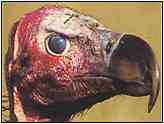 Lappet-Faced Vulture (Photograph Courtesy of Kurt Knoll Copyright ©2000)Of all the vultures the Lappet-faced would have the most formidable bill. Though useful for opening up a carcass, the bill comes in for little use when it comes to making noise as the lappet-faced Vulture is silent apart from hisses, grunts and yelps. It has a life span of around twenty years, compared to the fifty or sixty years of the California or Andean Condors. Male birds are smaller than females. Young birds are rather dull including over the head and neck. Food: Often associates with other vultures at carcasses, waiting until it sees the small Hooded Vultures are safe before itself approaching to feed. Will also eat birds eggs, kill small animals and catch termites or locusts. Has been seen to attack both young and adult flamingo, but mostly confines itself to carrion. Starts foraging early in the morning, just after sunrise when the thermals are strong enough to carry the birds aloft. The Lappet-faced Vulture can spot a carcass just over 1.6 kilometres away. When several species of vulture gather at a carcass protocol is determined by size and strength of beak. In this hierarchy, the Lappet-faced Vulture rips opens the cadaver and attacks the skin and offal; the Hooded Vulture digs out the softer portions of meat; then the Bearded Vulture polishes off what remains. They are an aggressive vulture and will often attack other species to steal their share of the food. When threatening others it runs forward with head lowered, neck outstretched, feathers of the back erect and wings widely spread. However, even the Lappet-faced Vulture will give way if the surly Marabou approaches wanting a share. After spending the day searching for food it returns to roost, usually in an acacia tree, about two hours before sunset.