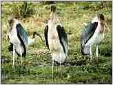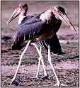 Marabou Storks (Photograph Courtesy of Hope Rutledge Copyright ©2000)Like the Turkey Vulture, the Marabou Stork defecates upon its legs and feet. It is known that the Turkey Vulture has strong antiseptic properties in their whitewash and indeed this is also the case with the Marabou stork, however their reasons for carrying out this act are different. Quite simply, it helps assist in regulating body temperature -- and also gives the false appearance that the birds have lovely white legs. Like many birds the Marabou Stork also pants when it becomes hot, again to lower its body temperature. These are particularly lazy birds and spend much of their time standing motionless, though once they take flight they are very elegant, using thermal up-draughts to provide the needed lift. Not a good short-distance flyer. Like other storks they fly with their especially long legs trailing behind, but unlike their cousins they keep their neck tucked well in and bent into a flattened S; this allows the weight of the heavy beak to be taken on the shoulders. Life span in the wild is unknown, however zoo birds have lived as long as 20 years. Immature birds have a woolly covering on their heads and do not gain the black in their plumage until about three-years-old. By four-years the full plumage will have grown in.