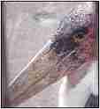 Marabou Stork (Photograph Courtesy of Bill Strahle Copyright ©2000)Physical Characteristics: The Marabou Stork is a huge 1.5 metre tall bird with a 2.6 metre wing span. In fact, it is so large and heavy that its leg and toe bones are hollow to reduce weight during flight. It has a long, dangling throat sac which is not associated with the ingestion of food; instead it is air-filled and probably used for courtship or breathing. The naked 18-inch inflatable pink sac is particularly conspicuous during the breeding season. It connects directly to the left nostril and acts as a resonator allowing the bird to produce a guttural croaking. While usually silent, the Marabou Stork will also emit a sound caused by beak clacking if it feels threatened. The pink head and neck is naked of feathers, with the rest of the plumage being black and white, and commencing with a white ruff at the base of the neck. Males and females are very alike with the female being slightly smaller.