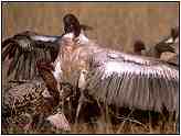 Ruppell's Griffon (Photograph Courtesy of Bill Strahle Copyright ©2000)Physical Characteristics: A large vulture with a wing span of 2.6 metres. The head and neck is covered by a thin, rather dirty-white, fluff. At the base of the neck is a white feather collar and the eye colour is yellowish-brown. Overall body colour varies from brown through to black and from a distance the plumage has the appearance of scales or spots. Whitish underbelly and chicken-like feet with sharp talons. Young birds have brown down on the head and neck, along with a darker, more evenly-coloured body. Very sociable, breeding, roosting and gathering in large numbers. When in flight they may cruise at 35 kilometres per hour and travel distances of up to 150 kilometres from a nesting site in the search for food. This is one of the more vocal vultures making loud, harsh calls at a nesting site and a type of squealing when at a carcass.