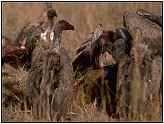 Ruppell's Griffons (Photograph Courtesy Gerald and Buff Corsi, California Academy of Sciences Copyright ©2000)Food: Rüppell's Griffons begin a search for food two hours after sunrise when the thermals have formed enough to give them needed lift. With their particularly keen eyesight this bird looks for the carcasses of large animals or carnivores in the middle of feeding on prey. They will often wait around for several days until the carnivore moves on leaving them to feast in peace. Unlike some vultures, the Rüppell's Griffon has a particularly strong bill and though it will start feeding on the soft parts of a carcass it soon moves on to eat even the toughest hide and bones. Like some other vultures, the tongue of this bird is covered in backward-facing splines, which assist in cleaning meat from bone. Very occasionally known to kill young antelope and catch snakes, large insects and lizards, but feeds most of the time on carrion. Like many species of vulture these birds gorge themselves at a carcass until they can barely take off.