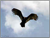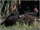 TurkeyOrder: Falconiformes. Family: Cathartidae. (New World vulture). Scientific Name: Cathartes aura. Common Names: Turkey Vulture. (Sometimes incorrectly called the Turkey Buzzard. 'Buzzards' are properly broad-winged hawks). Turkey VultureConservation Status: Common. The most abundant of all the New World vulture species. Extensively trapped and destroyed in many parts of their range due to the mistaken belief that they carry anthrax and other diseases. Have vanished from some areas where they were previously seen in large numbers. This is thought to be due to stricter laws on burying dead cattle. With no food the Turkey Vulture has been starved out of these areas. Considered pests on some Peruvian islands where they steal eggs and young birds. Rescue & Recovery: In most of the United States they are protected by law largely because their scavenging habits provide such a benefit in removing possible sources of infection. Geographical Range: Found from the southern U.S. to central Patagonia. (North and South America). Now starting to appear in Canada. Most of the birds found in the northern part of their range regularly migrate to the south. Habitat: A wide range of habitats. Plains, desert, forests, even urban situations. Turkey JohnsonPhysical Characteristics: Wingspan of some 26 centimetres and a distinctive appearance when in flight which comes from its long V-shape wings, long tail and rocking motion. The plumage is almost black, with a slightly iridescent appearance, especially on the wings, which are silvery. In proportion to the body mass this bird's head is very small. Genetic examination has demonstrated that the Turkey Vulture is more closely related to storks than to the vultures of Africa and Eurasia. They have an internal thermostat which aids in reducing energy loss overnight and in the morning they use the sun to reheat cooled organs. Once they take flight, their very broad wings and light body mean they can soar for long periods with an absolute minimum of effort. Their most interesting development is related to their sense of smell, something that is so finely tuned as to be almost unique among birds. In the United States Turkey Vultures are used to aid engineers in locating gas leaks; the engineers pump strong-smelling gases through pipes and note where the vultures gather. The Turkey Vulture gets its name from the resemblance it carries to the male wild turkey. Food: The Turkey Vulture is quite dependent upon its sense of smell to help locate food and the area of their brain controlling sense of smell is three times larger than of the Black Vulture. Research has shown they can locate a carcass within only twenty-four hours of death. These birds often go for days without feeding and when they do eat are very flexible about their meals, attacking even the tiniest carcass, rotten fruit, vegetables and even sea lion excrement. Have been known to kill young herons, ibis and even newborn pigs. Like the Black Vulture, this bird patrols roads searching for road kill; they have been so frequently seen doing this that dead animals on roads are now sometimes referred to as 'TV dinners', where TV stands, not for television, but for Turkey Vulture. Turkey VultureThese birds will devour the most putrid of meat and have a natural immunity the toxins which might kill any other creature. Botulism has no effect on the Turkey Vulture at all. Droppings are happily deposited upon the legs of the vulture as these contain an antiseptic coating which then protects the birds legs from contracting infection through the prey. Bald heads are also vulnerable to various bacteria, however the sun kills these off before any harm occurs. However, Turkey Vultures often do become ill and are very susceptible to stress. Food is frequently regurgitated, either to reduce bodyweight and allow take-off in the event of an emergency, or as a form of defence. It is said that skunks and the contents of a Turkey Vultures stomach have much in common. Reproduction: The nesting season for this bird occurs during the warmer weather and the female lays two, occasionally three, eggs in a cave or hollow log. Both parents share in the six week incubation and the are of the young, until they leave the nest at about ten weeks. The young are born with down feathers covering their heads and these are lost when the adult plumage grows in. Thumbnails (Click For Full-Size Image):